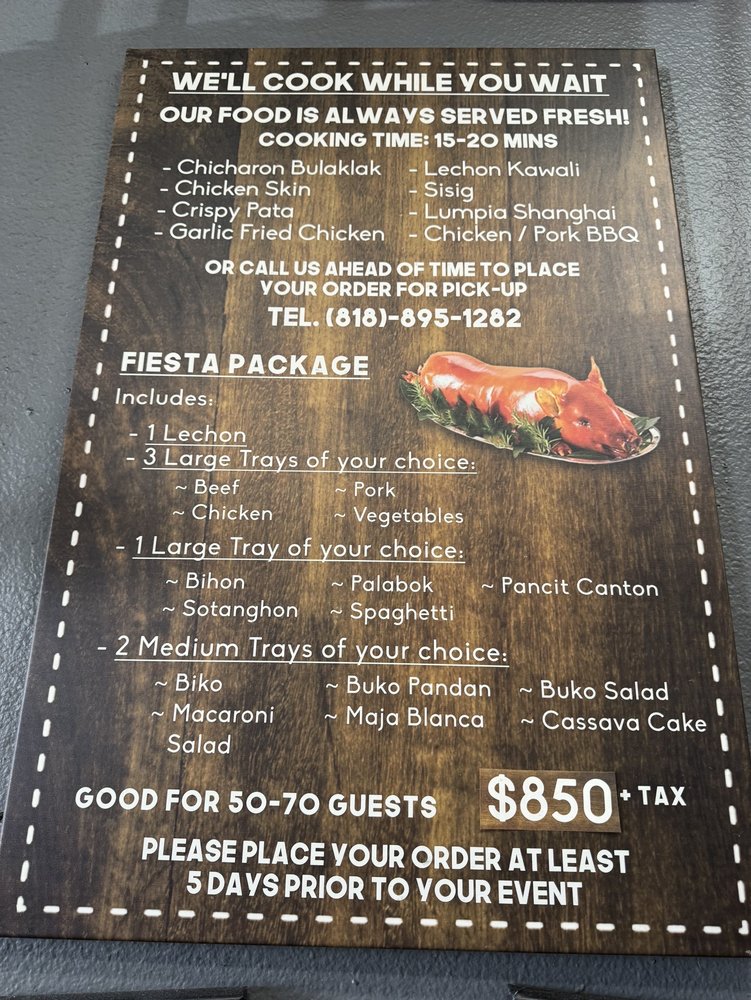 One of the standout features is their famous Turon, a crispy caramelized banana treat that's quickly become a local favorite—described by customers as the best in San Fernando Valley. Other crowd-pleasers include Garlic Fried Chicken and Crispy Pata, each cooked to perfection and bursting with flavor.